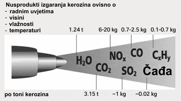 Neovisno radi li se o avionskom ili automobilskom motoru, mlaznom ili klipnom, kod svih motora koji koriste tekuća fosilna goriva, neki od naftnih derivata, kemičari bi rekli goriva na bazi ugljikohidrata, dva glavna produkta sagorijevanja su voda i ugljični dioksid. Zbog nepotpunog sagorijevanja, u ispušnim plinovima će se naći još mnoštvo drugih tvari, kao što su hlapljivi organski spojevi, anorganski plinovi, policiklički aromatski ugljikovodici, oksigenirane organske tvari, alkoholi, ozon i čestice čađe, no u puno manjim količinama.